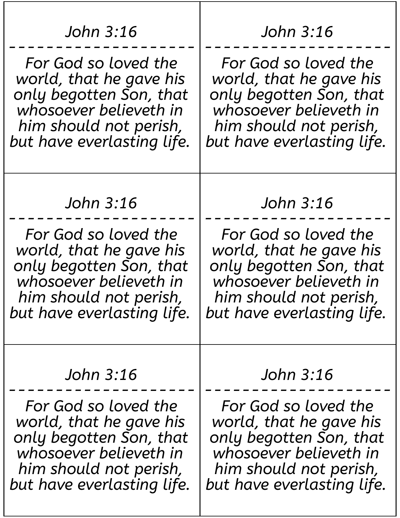 The goal was simple, I want to print bible verses on a table so I can print out multiple handouts on a single page. It would look something like the image below.