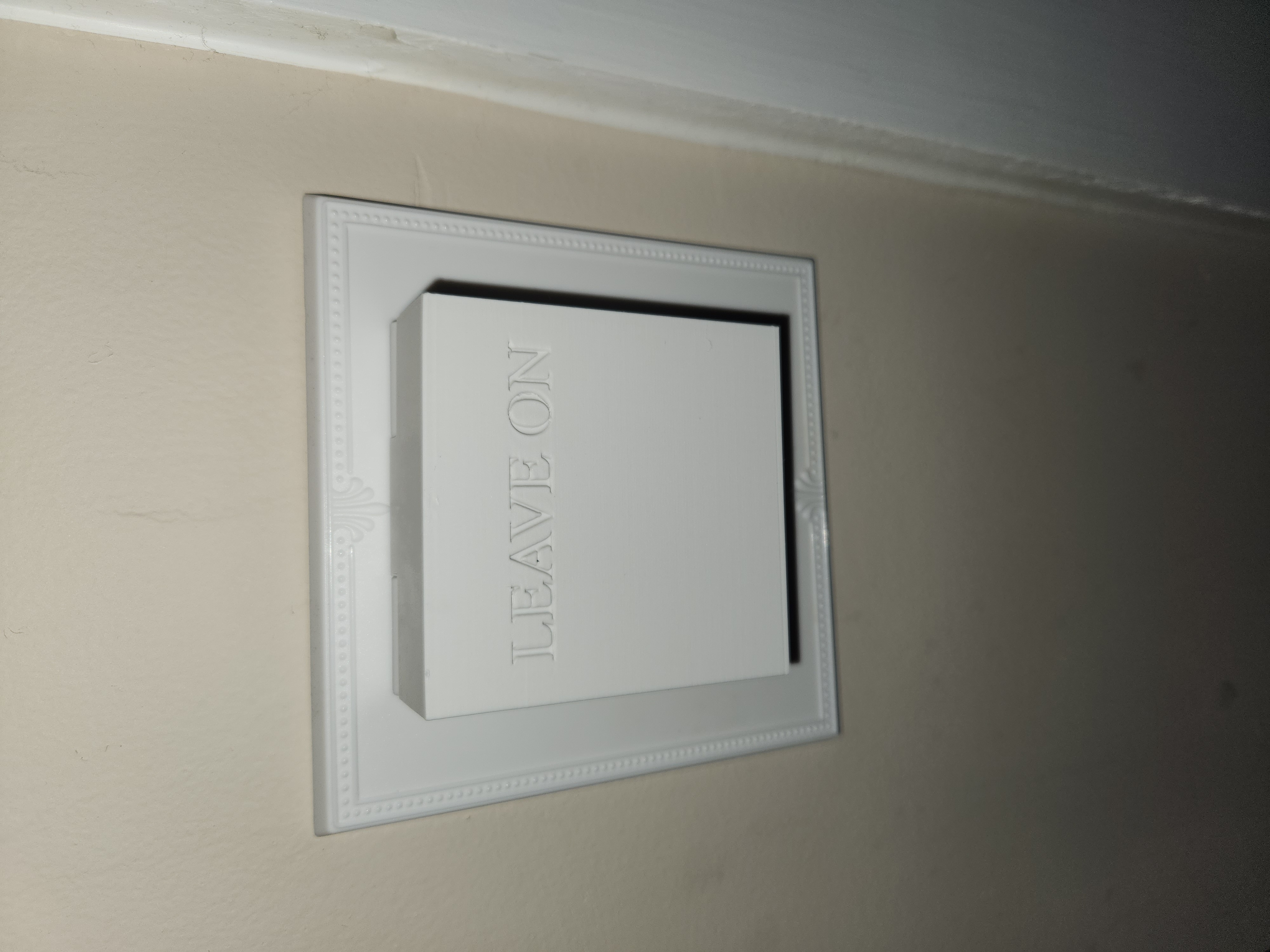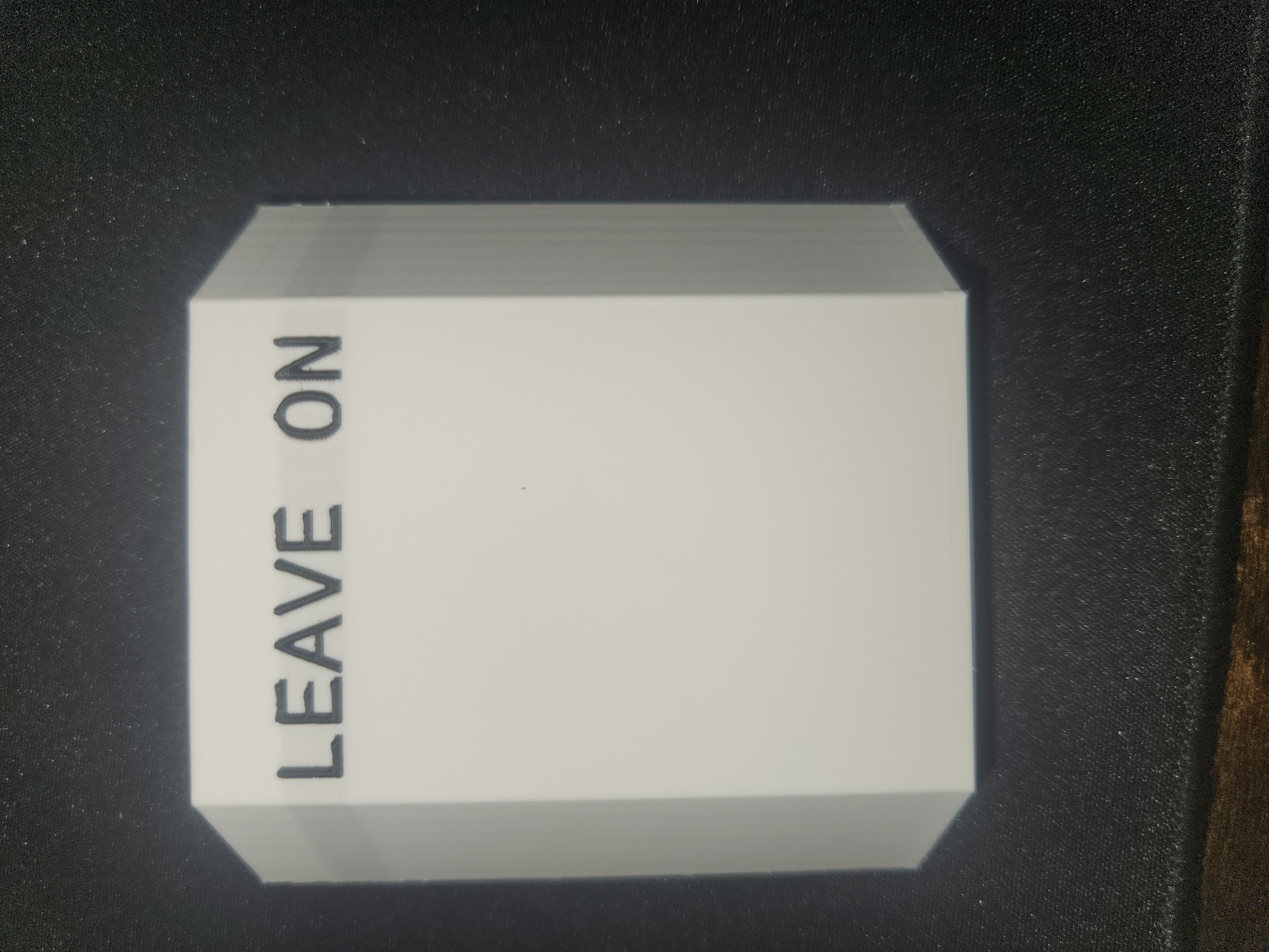 The first thing I did was strengthen the hinge by making it slightly thicker. I then slanted the sides to keep anyones clothing getting caught. Next, I made the box more shallow. I could still shave some depth off the box, but I felt I had reduced its size so it wouldn't get bumped. And by this time the AMS I ordered for my Bambu X1 Carbon arrived, so I changed the words to be out-set and black. Unfortunately I didn't have a big enough purge tower, so there is some color bleed into the white layers. I had anticipated having to reprint this after another failure, but so far this version has lasted the better part of a year. You can download the model here.